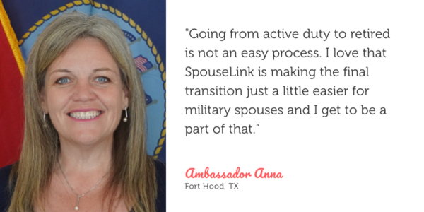Anna is our first Ambassador to focus her activities on our Veteran and transitioning servicemember audience. You will find her hosting regular SpouseLink live sessions and contributing to the SpouseLink blog. She’s based in Fort Cavazos, but available to you wherever you are. Link to lives.