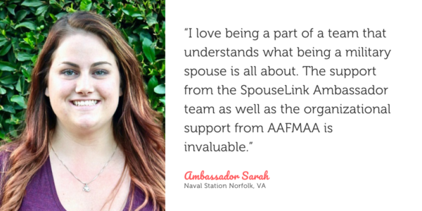 The SpouseLink Ambassadors are creative, professional, knowledgeable, and friendly representatives of both SpouseLink and AAFMAA. These active-duty and Veteran military spouses host and participate in military and related events, connecting with members of their local communities throughout the year — in-person and online.